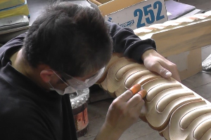 平らな木地の面では均一に研磨する大変さがあり、こまかな彫刻部分は木地まで紙鑢(かみやすり)が届くように細かく折り込んで研磨する大変さがある等、技術のいる作業となります。